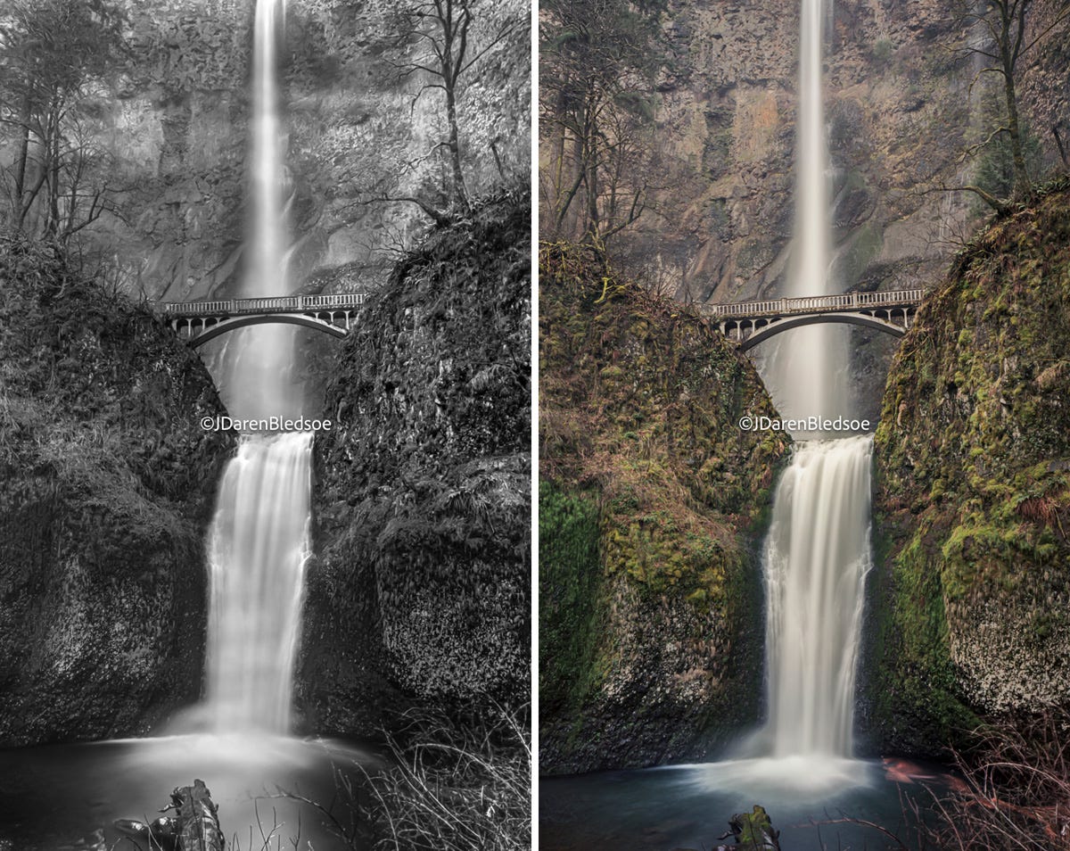 This month’s frame returns to one of Oregon’s most iconic landscapes, Multnomah Falls, one subject, but through two very different eyes.